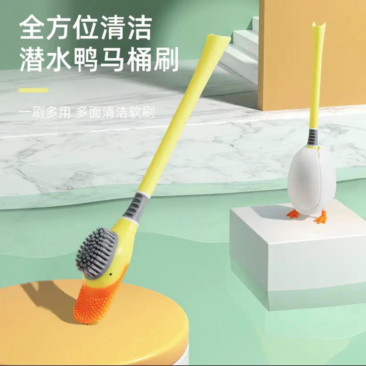 A diving duck shape design toilet seat cleaner. It has a flexible rubber tip and bristle brush to clean toilet seat and also hard to reach regions of the toilet crevices. It can also be wall mounted by placing the brush for storage.
