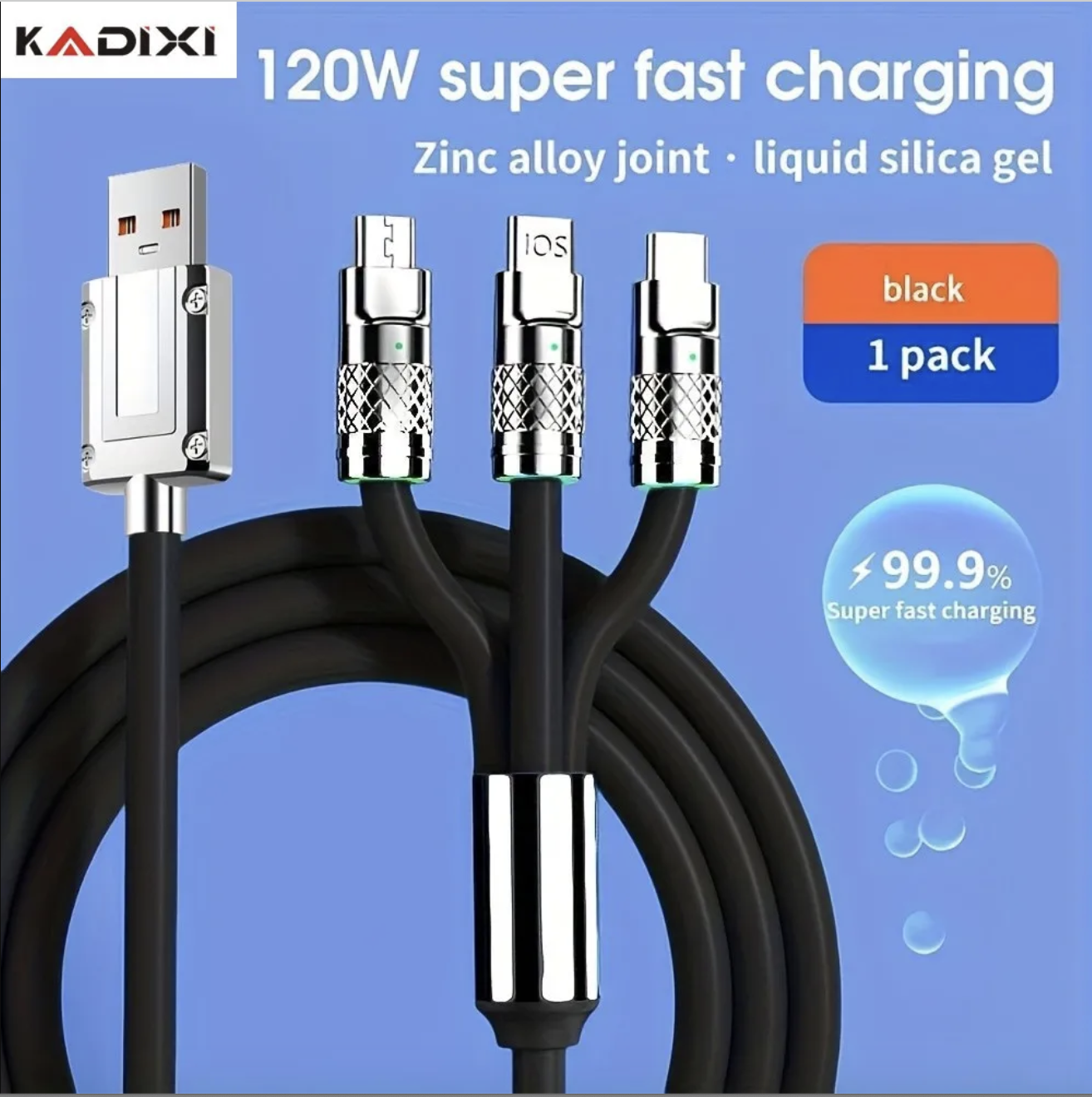 3 In 1 Zinc Alloy Charger Cable 120W 6A Super Fast Charger Type C Liquid Silicone Cable Micro Usb Cable