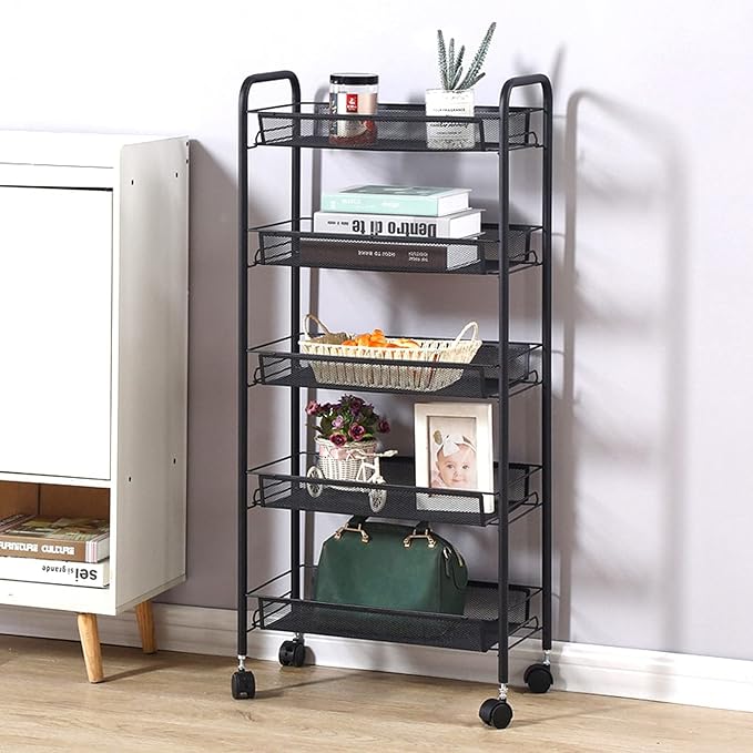 This trolley is perfect for organising and sorting stuff in the kitchen, bathroom, office, etc. This household trolley features an iron construction, making it sturdy and durable. The space-saving cart has 4 wheels, and 2 wheels have brakes for easy moving and stalling. The mesh baskets are strong and removable, which provide additional storage space and make full use of the room. The trolley is ideal for storing toys, keys, food, etc.